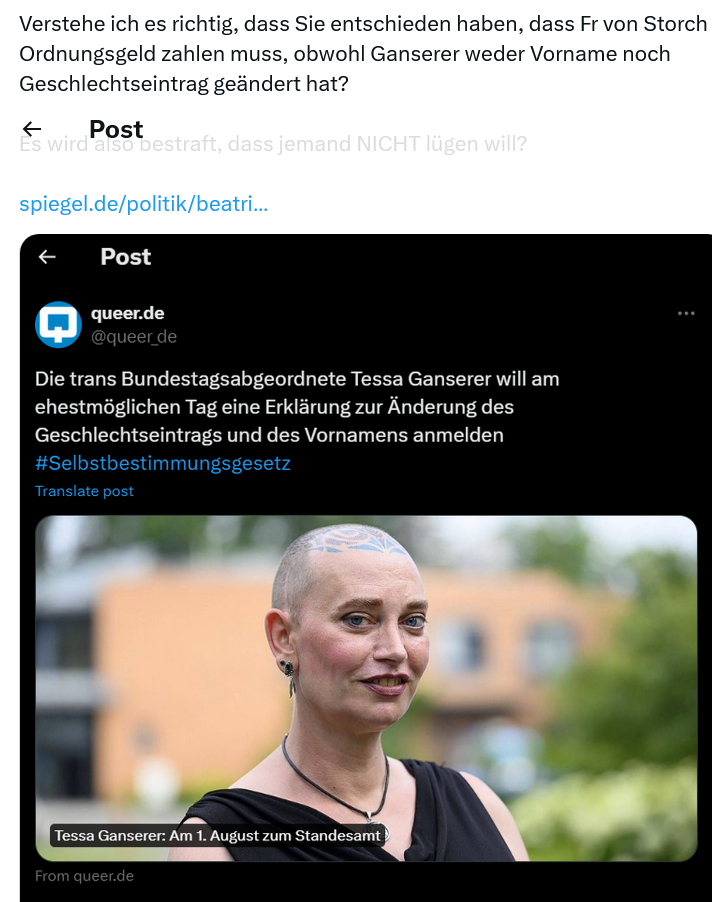 Storch habe unter anderem gesagt, Ganserer sei »biologisch und juristisch ein Mann«, und von der Grünenpolitikerin als »Herr Ganserer« gesprochen.