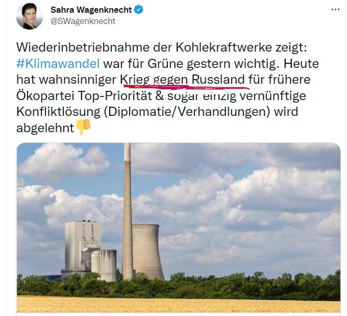 in ihren Augen hat nur der Westen schuld an dem Krieg und Waffen keine lösung ist die ist verkehrt also gehört sie nicht zu den linken.