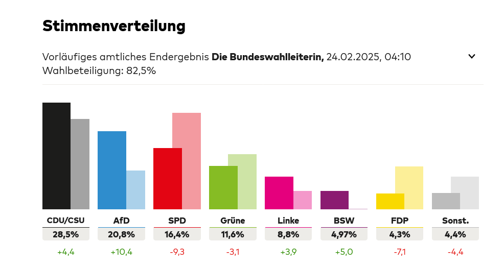 Dabei hätte ich vor der Auszählung eher damit gerechnet, dass die Linke unter 5 % kommt und das BSW in den Bundestag einzieht. Erstens kommt es anders, zweitens als man denkt.