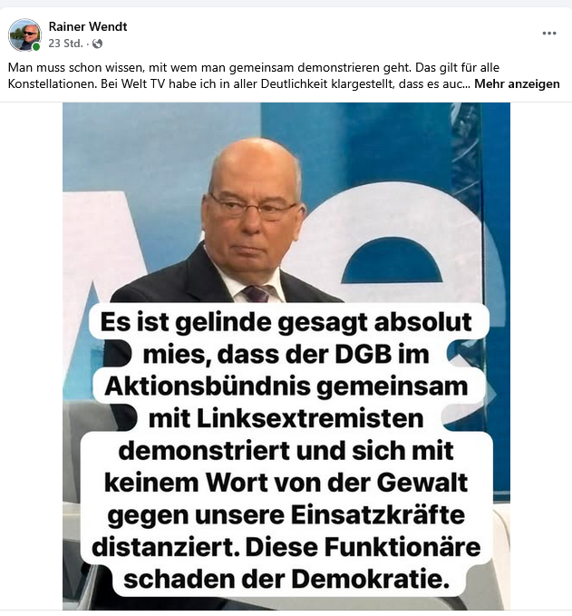 Rainer Wendt, seit 2007 Bundesvorsitzender der Deutschen Polizeigewerkschaft, am 29.11. 2025 auf Facebook: