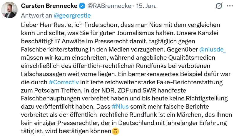 ... Restle musste sich vom Rechtsanwalt Carsten Brennecke eines Besseren belehren lassen, denn Brennecke entgegnete kühl: „Wenn Sie also von „seriösem“ Journalismus sprechen, dann sollten wir beide gerne darüber diskutieren, an welchen Maßstäben wir festmachen, was seriöser Journalismus ist oder nicht. ...