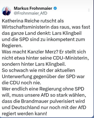 >>"Der Koalitionspartner ist in den letzten Wochen damit aufgefallen, Vorschläge zu unterbreiten, die teuer, wirkungsschwach und verfassungsrechtlich fragwürdig sind", sagte Reiche bei "Welt TV"<<