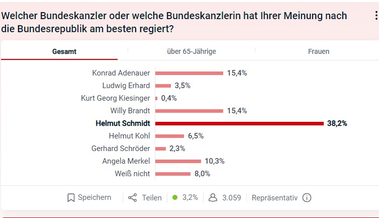 Ich bin sehr überrascht über das verhältnismäßig schlechte Abschneidens Konrad Adenauers im vergleich zu Helmut Schmidt. Gründe könnten das Wirken geschichtlichen Vergessens bei Adenauer und dagegen bei Schmidt seine 2. Karriere in den Medien und seine Professionalität in der medialen Selbstdarstellung sein. Aber natürlich war er auch eine "ganz große Nummer". Nur wäre ich nicht sicher, wen von den Beiden ich auf Platz 1 setzen würde.