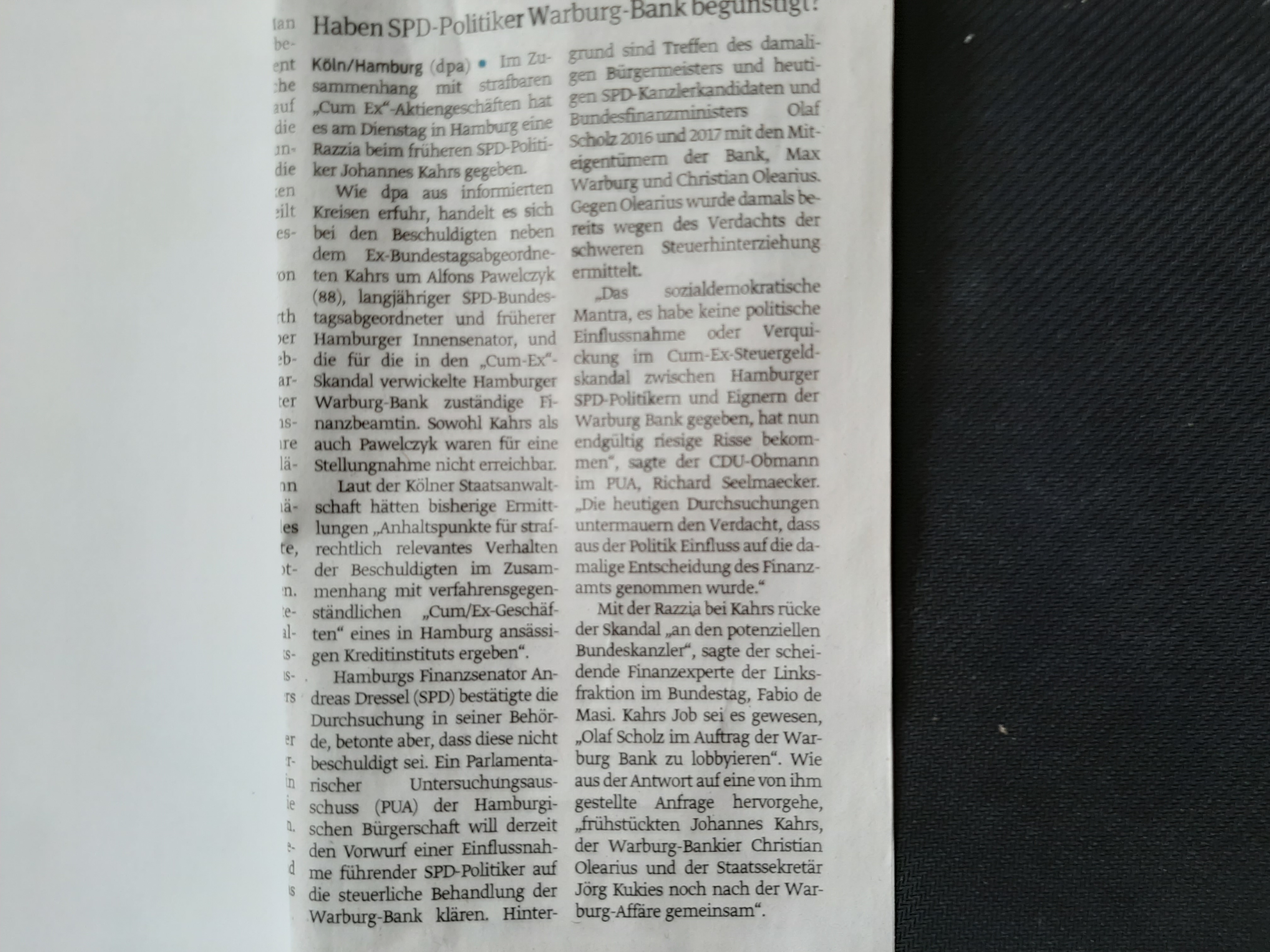 Die Razzia fand beim ehemaligen SPD-Abgeordneten Kahrs und zwei Finanzbeamten statt. Bei der einen Finanzbeamtin wurden die Privaträume durchsucht, gegen die andere wird vor Gericht wegen Falschaussage ermittelt. Laut Scholz zwei Entlastungszeugen. Morgen wird im Hamburger Untersuchungsausschuss ein Betriebsprüfer angehört, der gegen eine Entscheidung der "Entlastungszeugin" rebellierte, die hinterzogenen Steuern der Warburg nicht einzuziehen.