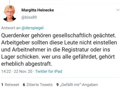Wenn ich die jetzigen Maßnahmen für grundfalsch erachte und damit auch nicht hinterm Berg halte(Schließung der Restaurants), mich aber immer meinen Mitmenschen rücksichtsvoll verhalte (die AHA-Regeln beachte), macht mich das zu jemanden, den man nicht einstellen soll und deshalb stigmatisiert werden darf? Die Frau ist eine Spalterin.