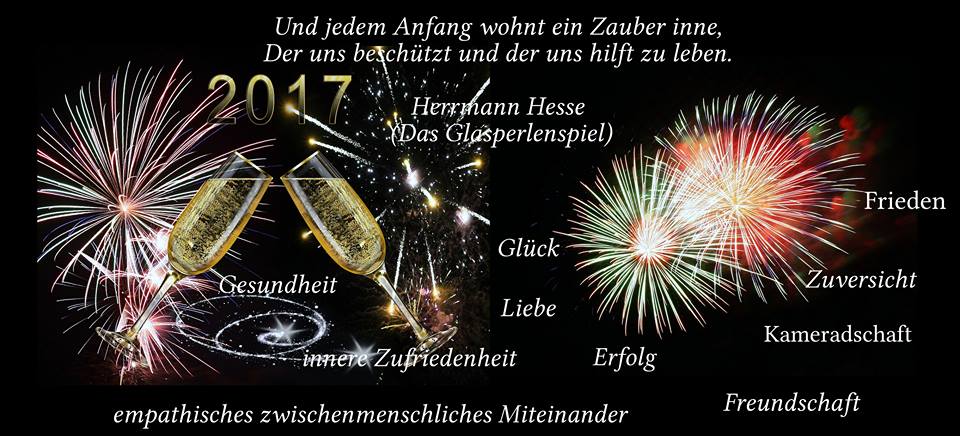 Ich hoffe Ihr seid alle gut ins NEUE JAHR 2017 gekommen und für das Jahr 2017 wünsche ich Euch allen Gesundheit, Glück, Freuden und Erfolg.