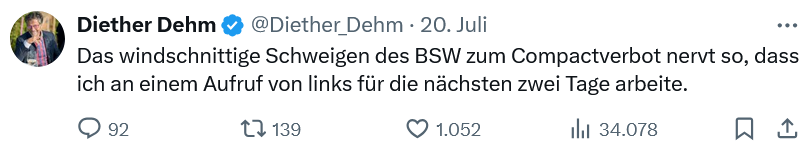 An der Stelle ist Zurückhaltung gar nicht so doof von Wagenknecht. Faeser bekommt so viel Gegenwind von Mainstream - Journalisten (Don Alphonso, Fleischhauer etc.), dass Wagenknecht es nicht nötig hat, Rechtsradikalen zur Seite zu stehen und das Bild der Hufeisen - Theorie aufzurufen. Jedenfalls halte ich Wagenknecht für politisch urteilsfähiger als Dehm.
