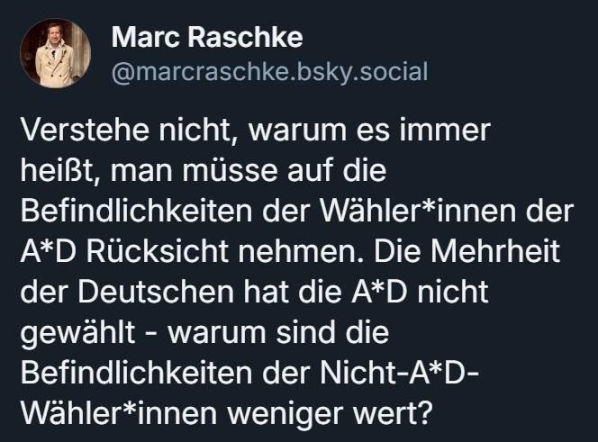 Bei uns in Sachsen-Anhalt haben wir einen Kandidaten von der "rechtsextremen und rechtspopulistischen AfD" - diese Merkmale dürfen schließlich in keinem Zeitungsartikel fehlen, was 37 % der Wähler, mich eingeschlossen, längst nicht mehr abschreckt, weil ausgelutscht - von dem ich hoffe, dass er mit absoluter Mehrheit der nächste Ministerpräsident wird - Ulrich Siegmund. Mit der CDU zusammen regieren würde funktionieren, um sich endlich von der linkspopulistischen Partei zu lösen, die bei uns bei 8 % liegt, wenn da nicht die Brandmauer wäre. Aber vielleicht bröckelt die zuerst in Sachsen-Anhalt.