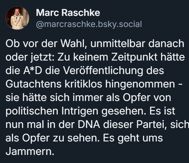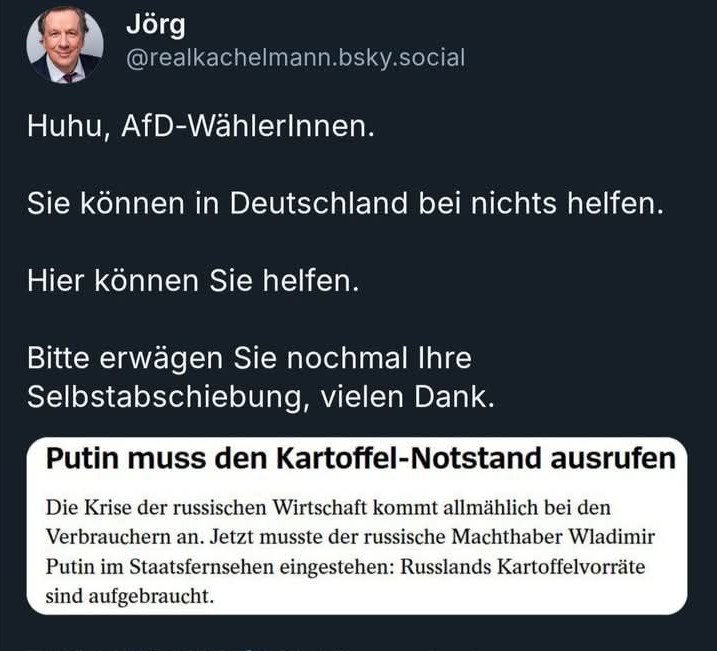Sie müssen auch noch einen Appell an Putin richten, damit er die befreit. Das wäre schließlich nach Putins Agenda ein legitimer Kriegsgrund, denn schließlich befinden sich unter den verfolgten AfDlern jede Menge putintreue russische Staatsbürger.