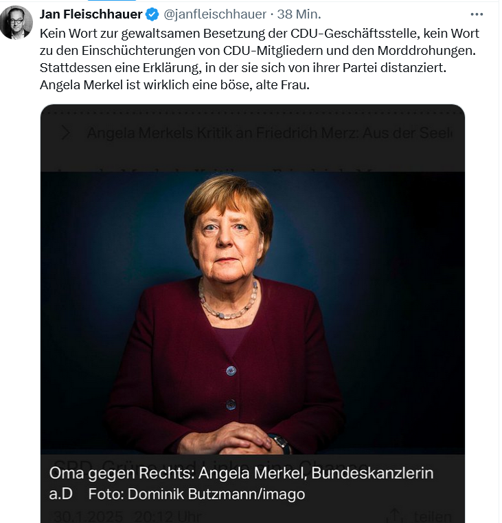 Merkel war damals für den Linksruck der CDU verantwortlich, nun versucht Merz durch einen entsprechenden Rechtsruck die CDU wieder ins ursprüngliche Fahrwasser zu bringen. Kein Wunder, daß dies Merkel nicht schmeckt.