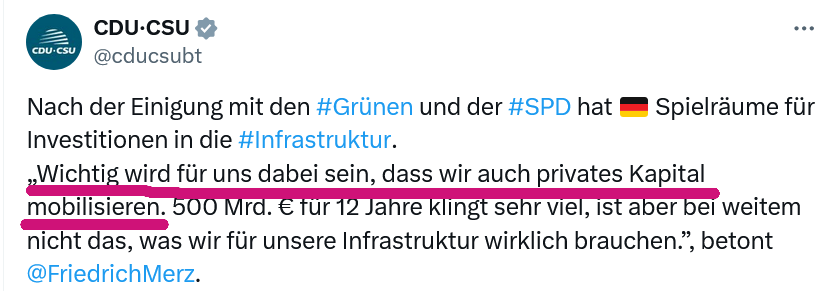 Mir kann keiner erzählen, dass sich 5 Minuten nach der BTW plötzlich die politischen Verhältnisse so sehr geändert haben, dass er diese Schuldenorgie plötzlich für gerechtfertigt hält. Ich höre noch seine Wahlkampfsprüche, dass man mit den Steuereinnahmen auskommen muss und kein exorbitantes "Sondervermögen" aufnimmt.