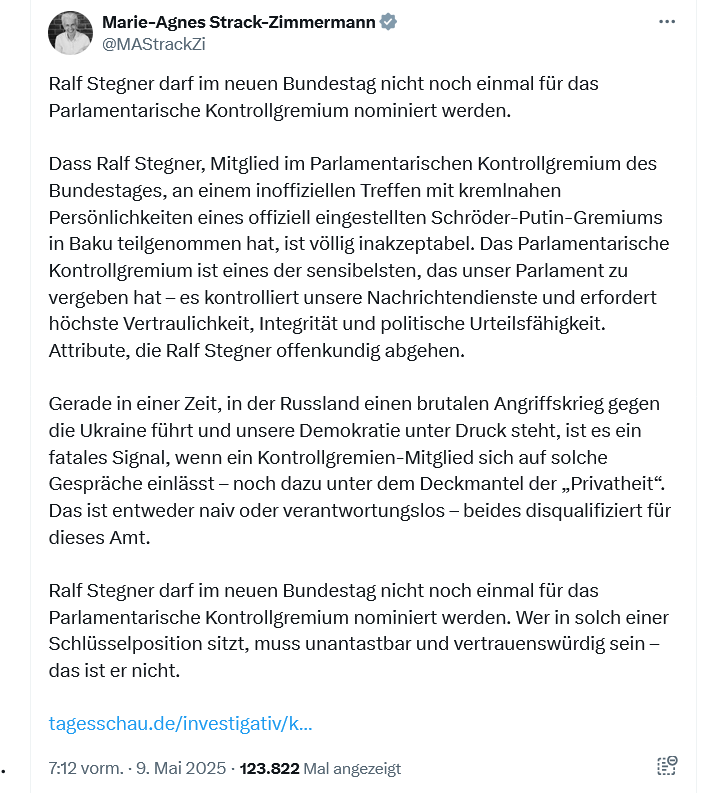 maxikatze hat geschrieben:Wie lange wird die CDU-Basis Merz' Verrenkungen noch durchgehen lassen? Wenn er beim Thema Migration auch noch einknickt, werden sich Mitglieder abwenden und aus der Partei austreten. Merz hat sich in seiner von ihm errichteten Brandmauer selbst eingemauert.