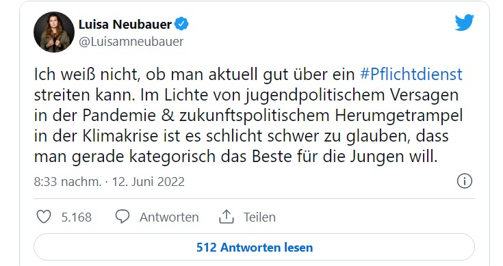 maxikatze hat geschrieben:Der Vorschlag des Bundespräsidenten Frank-Walter Steinmeier zur Einführung eines Pflichtdienstes für alle jungen Menschen stößt bei fff-Leuten und Jusos auf Ablehnung. Habt ihr von Schwätzern was anderes erwartet?![]()