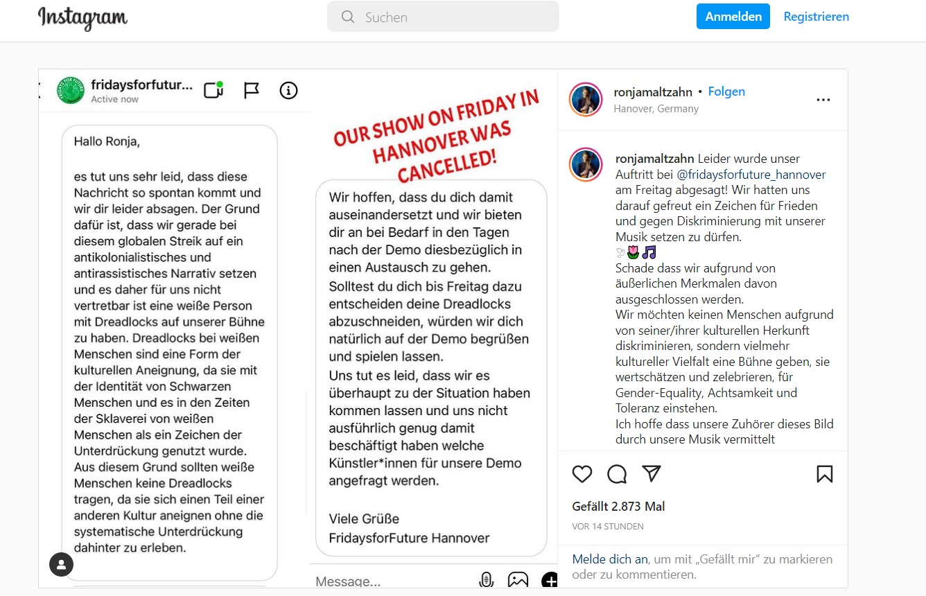 AlexRE hat geschrieben:"Fridays for Future" lädt eine Sängerin aus, weil sie die Haare zu Dreadlocks geflochten hat und dies eine "kulturelle Aneignung" sei: