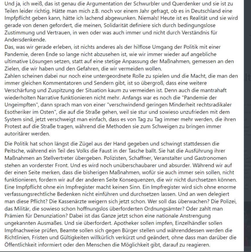 Nur ist es einem Virus so ziemlich egal, was irgendwelche Bürger wollen. Außerdem sind viele selbst für die Dauer der Pandemie mitverantwortlich,