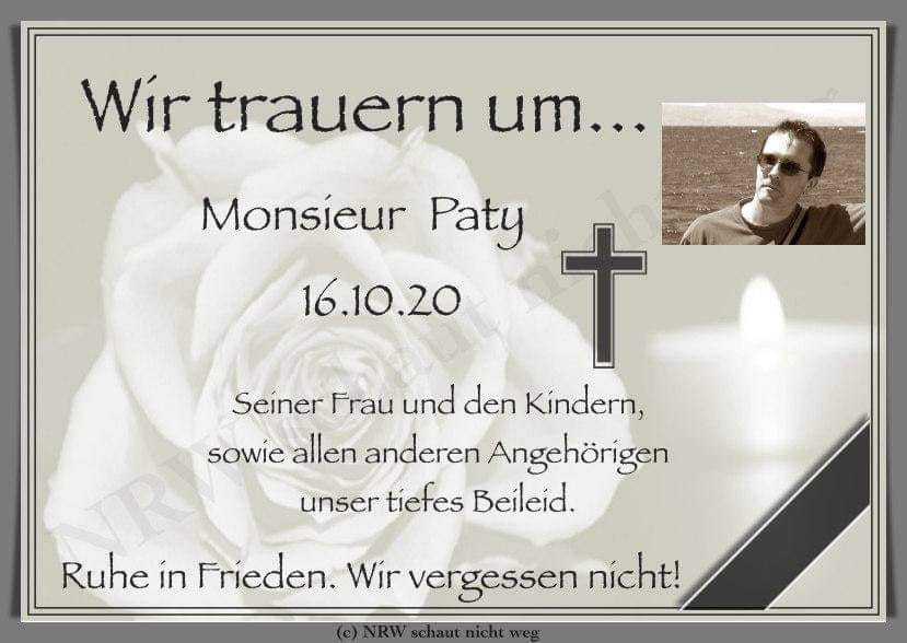 Denunziert von einer 13-Jährigen. Kriminalisiert von deren Vater. Ermordet von einem 18-Jährigen. Das Problem sind die Einwanderung, der islamische Normalzustand und die Islamappaeser, die eine Trennung von Islamisten und Moslems fordern, dann aber Islamisten unterstützen. Statt die Karikaturen noch mal abzubilden, kann über diese Appeaser berichtet werden, denen wir die jetzigen Zustände zu verdanken haben. Der Dealer GeorgeFloyd, der im April diesen Jahres mutmaßlich durch Polizeigewalt starb, wurde damals innerhalb weniger Tage medial zum Märtyrer hochgejazzt und sogar in einem goldenen Sarg beerdigt. Vom ermordeten Lehrer, den man tatsächlich als Märtyrer begreifen kann, da er buchstäblich für unser aller Freiheit starb, werden wir sicher bald nichts mehr lesen oder hören.