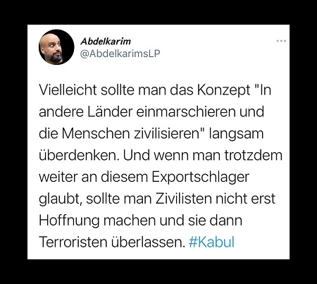 Es waren auch die Grünen, die diesen Irrsinn von Einsatz in Afghanistan zugestimmt habe, als die Grünen von 1998 bis 2001 in der Regierung I von Kanzler Schröder saßen, zudem haben die Grünen in Bundestag seit 20 Jahren jeder weiteren Afghanistanmissionen der Bundeswehr zugestimmt und die Grünen haben sich in den letzten Tagen auch nicht mit Forderungen hervorgetan, beim Abzug der Deutschen und der Ortskräfte aus dem failed state Afghanistan so schnell wie möglich zu evakuieren!