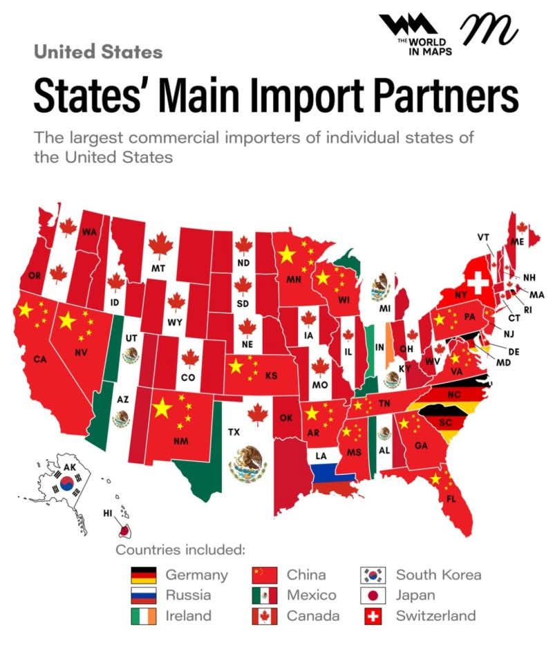 Das wird aber auch die amerikanische Wirtschaft vor Probleme stellen. Hier eine Karte, die die Schwerpunkte des Außenhandels der verschiedenen US - Bundesstaaten veranschaulicht:
