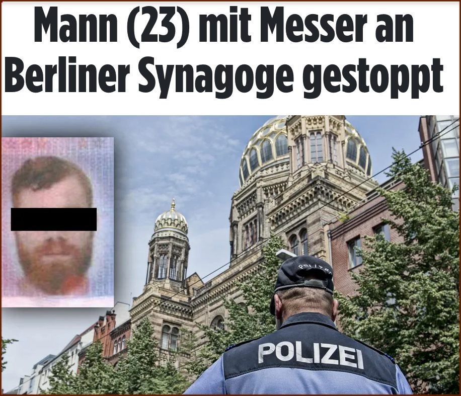 Genau genommen lief ein Mann, dessen Papiere ihn als einen in Damaskus geborenen Syrer mit Aufenthaltsrecht in Deutschland auswiesen, mit einem ca. 20 Zentimeter langen Messer auf die Wachkräfte am Eingang der großen Synagoge in der Oranienburgerstraße In Berlin zu, rief Allah hu Akbar und ergänzte diese Worte noch mit dem schönen Zusatz F**ck Israel, vermutlich um der Polizei etwas bei der Aufklärung seiner ganz und gar rätselhaften Tatmotive behilflich zu sein.