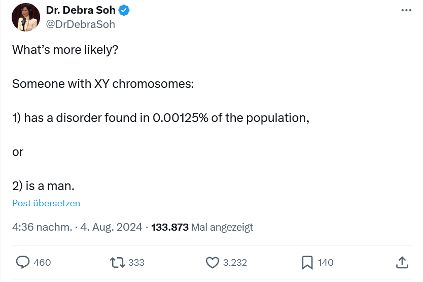 Screenshot 2024-08-04 at 22-00-49 Dr. Debra Soh auf X „What’s more likely Someone with XY chromosomes 1) has a disorder found in 0.00125% of the population or 2) is a man.“ _ X.png